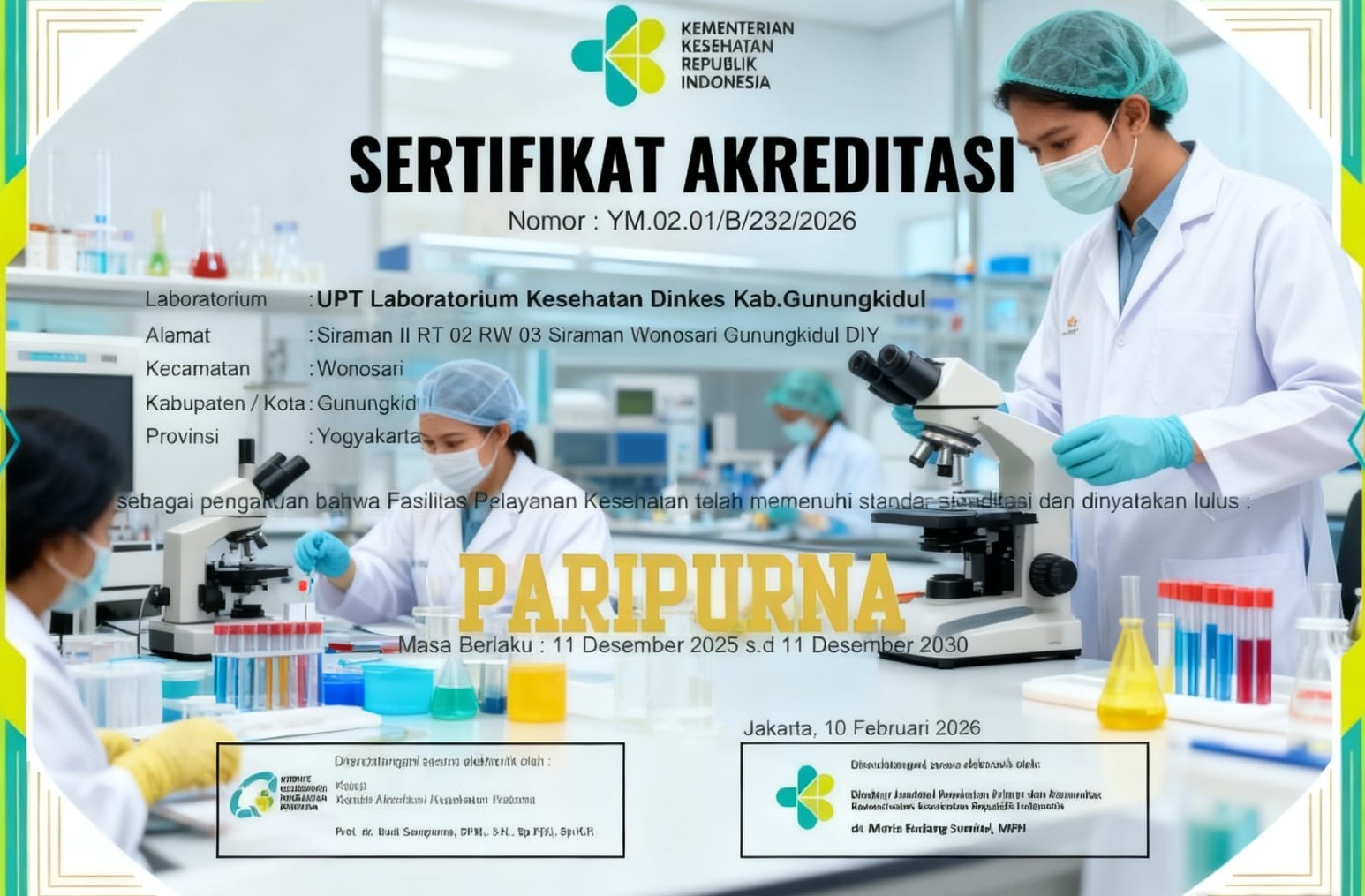 Gunungkidul – UPT Laboratorium Kesehatan Kabupaten Gunungkidul menorehkan prestasi membanggakan dalam pelayanan publik bidang kesehatan. Setelah melalui proses penilaian yang ketat dan komprehensif, UPT Laboratorium Kesehatan resmi dinyatakan meraih Akreditasi Paripurna, predikat tertinggi dalam standar mutu pelayanan laboratorium kesehatan