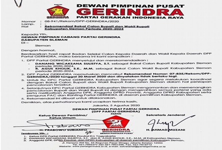 Pertama, DPP Gerindra menyetujui dan merekomendasi Profesor Dr. Sutrisna Wibawa M.Pd. sebagai bakal calon Bupati dan Mahmud Ardi Widanto SIP sebagai bakal calon Wakil Bupati Gunungkidul 2020-2024.