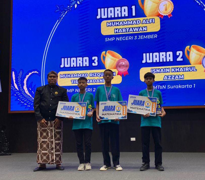 Untuk Kategori Matematika, Juara 1: Muhammad Alwi Hartawan – SMP Negeri 3 Jember, Juara 2: Isnain Khairul Azzam – MTsN Surakarta 1 dan Juara 3: Muhammad Rizqullah Tirta Madani – SMP Negeri 2 Jember